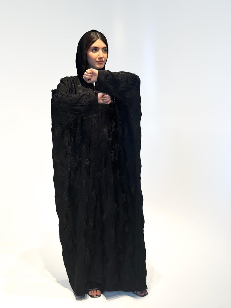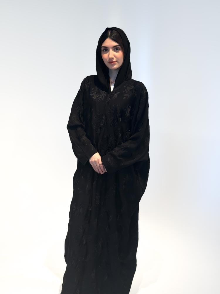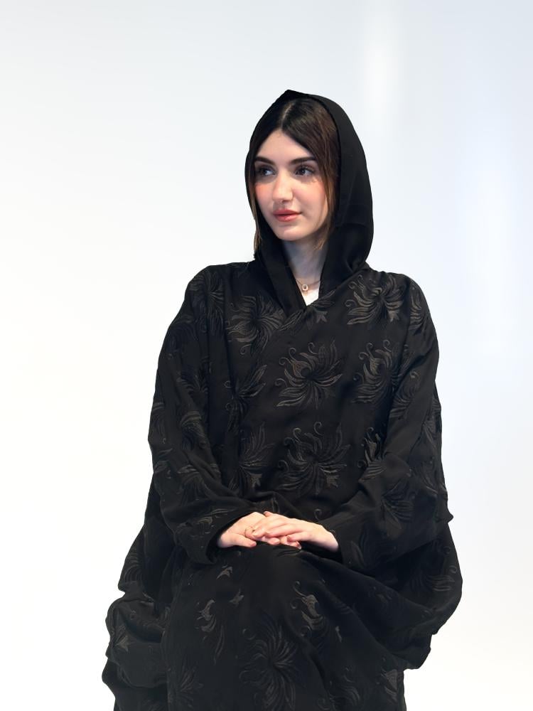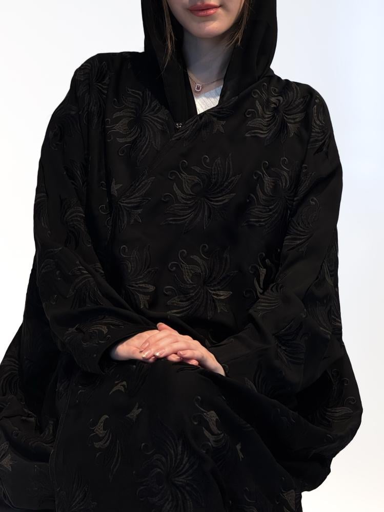 عباية سوداء أنيقة قماش إنترنت كريب ملكي عالي الجودة، بتطريز بارز بنقوش أنثوية تضيف لمسة راقية. تأتي بتصميم واسع وانسيابي بلمسات فنية